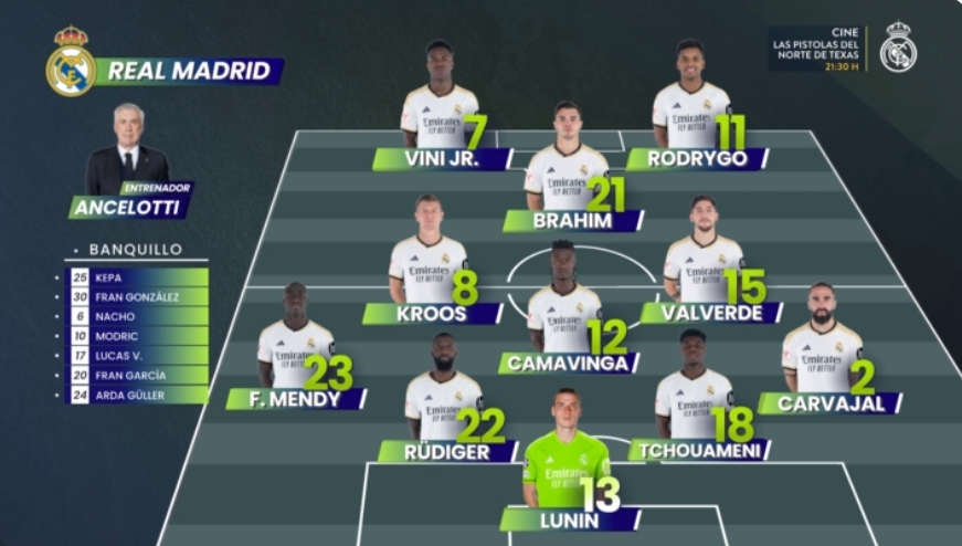 皇马首发:13-卢宁、2-卡瓦哈尔、18-琼阿梅尼、22-吕迪格、23-门迪、15-巴尔韦德、12-卡马文加、8-克罗斯、21-迪亚斯、11-罗德里戈、7-维尼修斯