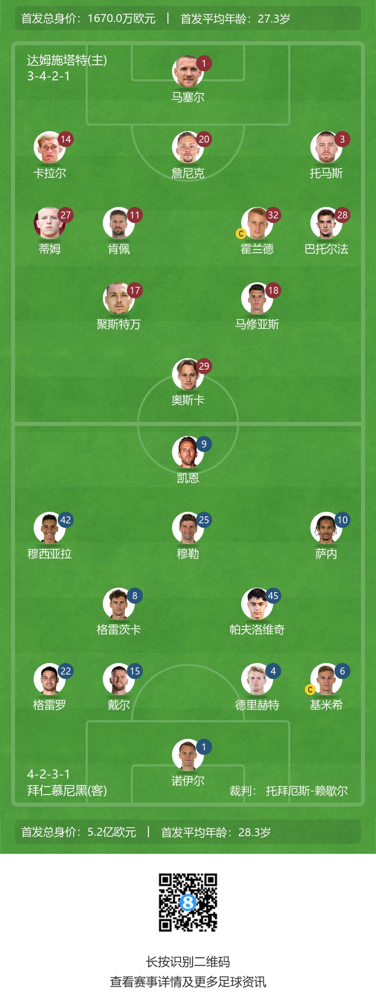 达姆施塔特首发:1-舒亨、3-伊舍伍德、20-詹尼克-穆勒、14-克拉雷尔、32-霍兰德、17-聚斯特万、18-洪萨克、28-弗兰季奇、11-肯佩、27-斯卡尔克、29-维尔赫姆森
