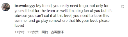 我的朋友,你真该离队了,不仅是为了你自己也是为了球队!我是你的忠实粉丝,但很明显你不在这个级别,今夏去一个符合你水平的地方吧,走吧!