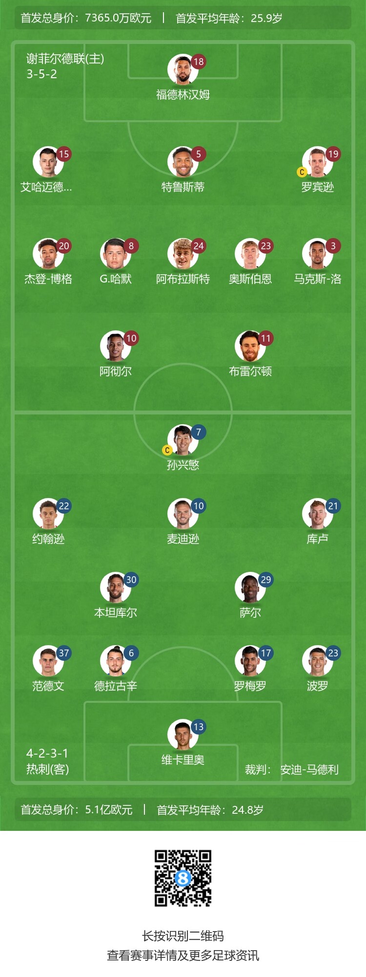 截至赛前,热刺排名第5,领先身后的切尔西3分,两队将为欧联杯资格展开争夺;谢菲联则是早早就锁定了一个降级的席位。