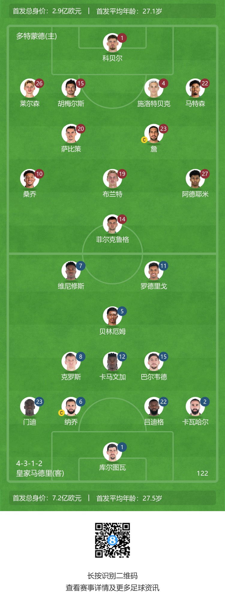 多特首发: 1-科贝尔、26-莱尔森、15-胡梅尔斯、4-施洛特贝克、22-马特森、 23-詹、20-萨比策、27-阿德耶米、 19-布兰特、10-桑乔、14-菲尔克鲁格