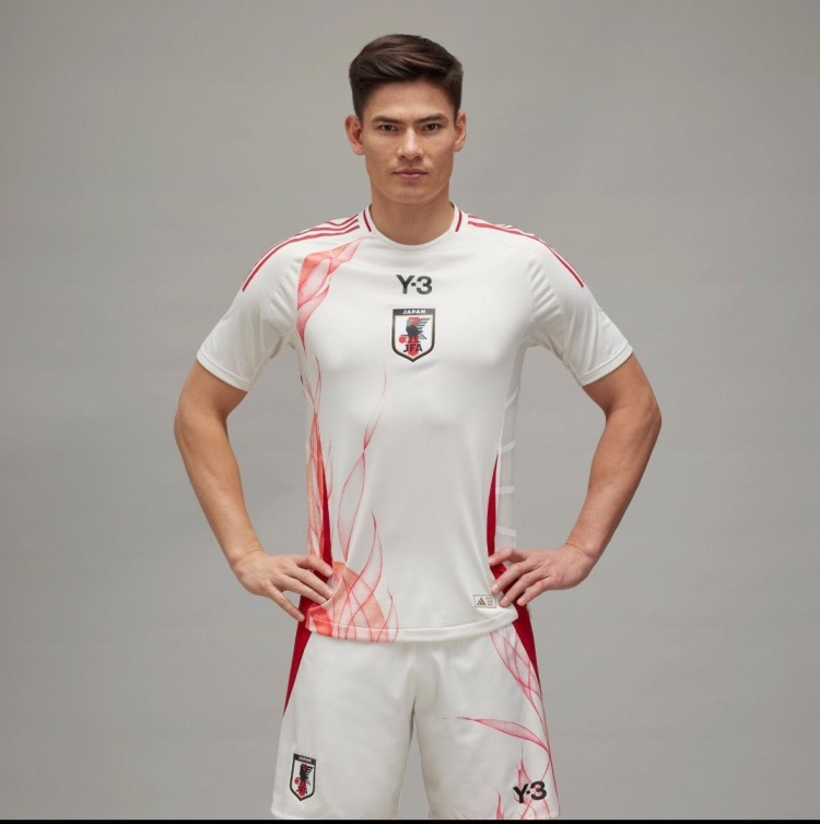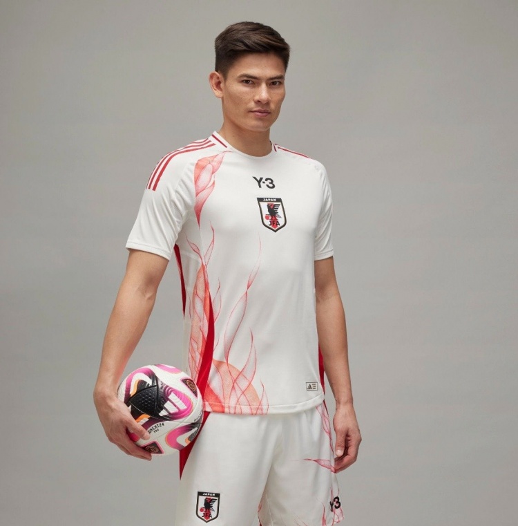 日本队新款客场球衣采用白色+红色的色彩搭配。阿迪达斯商标换成Y-3品牌标志,队徽在胸前中间位置。