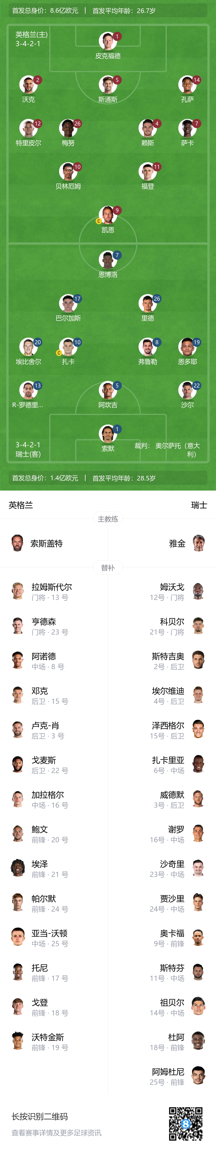 英格兰替补:13-拉姆斯代尔、23-迪恩-亨德森、3-卢克-肖、15-邓克、22-戈麦斯、8-阿诺德、16-加拉格尔、25-沃顿、17-伊万-托尼、18-戈登、19-沃特金斯、20-鲍文、21-埃泽、24-帕尔默