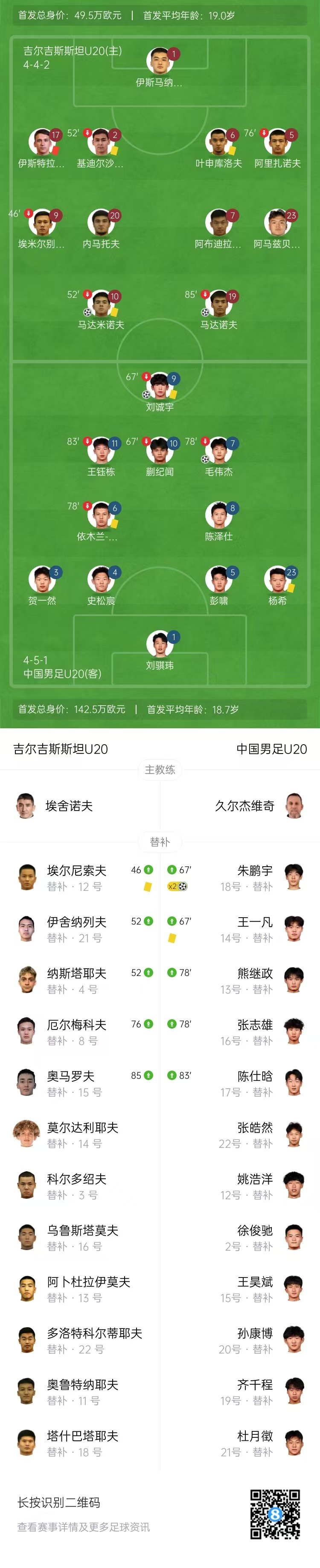 第48分钟,贺一然前场反抢成功,蒯纪闻杀入禁区后转身传中,毛伟杰后点头球建功,中国U20队3-1吉尔吉斯斯坦U20队。↓