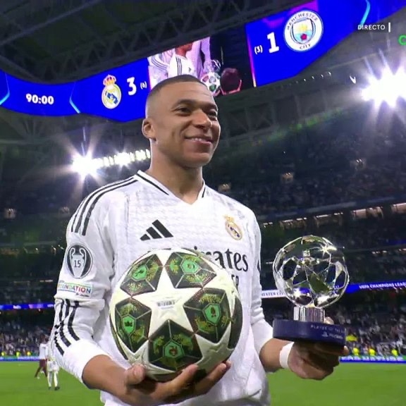 姆总霸气外露!姆巴佩赛后手持全场最佳奖杯+戴帽足球合影