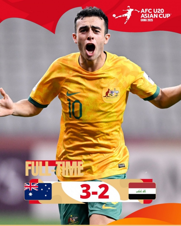 直播吧2月22日讯 北京时间2月22日19:30,U20亚洲杯1/4决赛,澳大利亚U20与伊拉克U20的比赛在深圳宝安体育中心体育场打响。上半场,阿穆里内切兜射破门,约万诺维奇轰出世界波扳平,穆斯塔法反击破门。下半场,基基亚尼斯兜射扳平,巴多拉托世界波反超比分。最终,澳大利亚U20以3-2逆转击败伊拉克U20,晋级四强。
