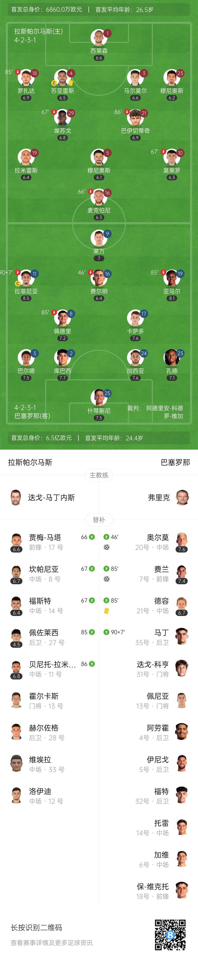 下半场补时8分钟。最终全场比赛结束,拉斯帕尔马斯0-2巴萨。