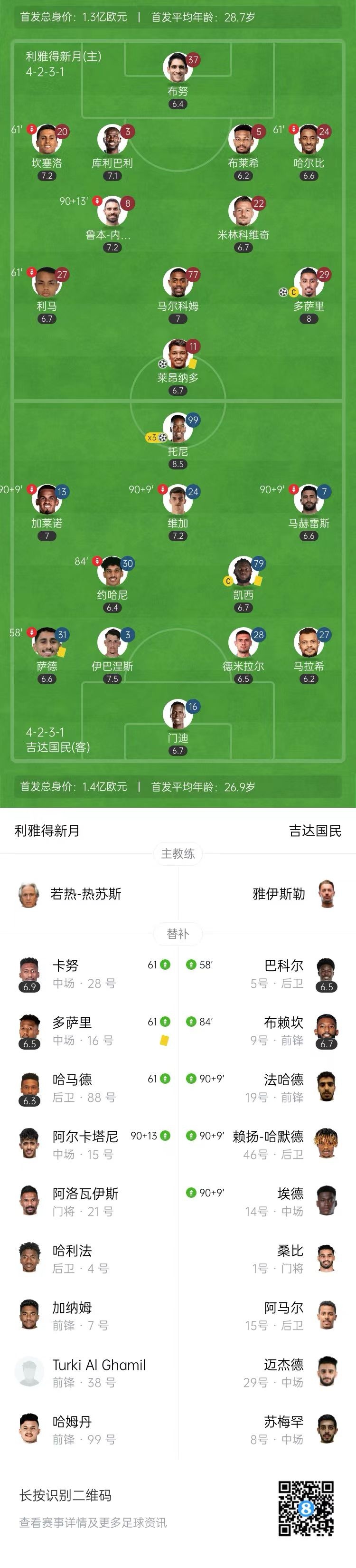 直播吧3月1日讯 北京时间3月1日3:00,沙特联第23轮,利雅得新月坐镇主场王国竞技场迎战吉达国民。上半场,托尼铲射错失空门。下半场,托尼连入两球助吉达国民建立优势,马尔科姆助攻多萨里破门,随后多萨里制造点球,莱昂纳多主罚命中扳平比分,托尼反越位抽射戴帽。全场比赛结束,利雅得新月主场2-3不敌吉达国民,多赛一场落后榜首的吉达联合5分。