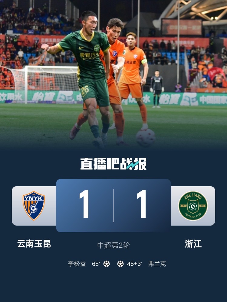 直播吧3月1日讯 直播吧3月1日讯 中超第二轮,云南玉昆坐镇主场玉溪高原体育中心迎战浙江队。上半场,韩子龙造险,弗兰克连场破门。易边再战,李松益打进云南玉昆队史中超首球,侯永永、埃弗拉双双失单刀。最终云南玉昆主场1-1浙江队。积分榜方面,云南玉昆收获队史中超首分,浙江队开局两连平。