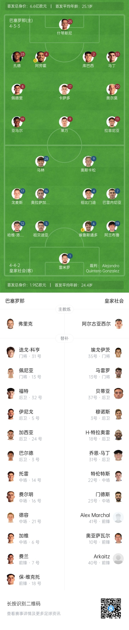 巴萨首发:25-什琴斯尼、2-库巴西、4-阿劳霍、23-孔德、35-杰拉德-马丁、8-佩德里、17-卡萨多、11-拉菲尼亚、19-亚马尔、20-奥尔莫、9-莱万