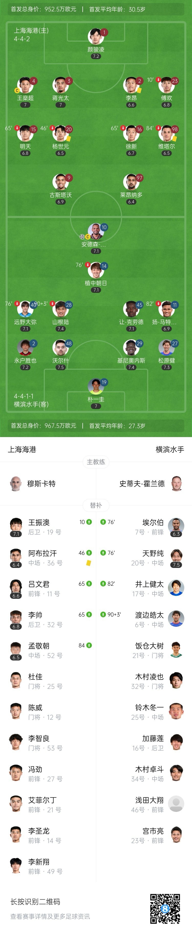 半场战罢,海港暂0-1横滨水手。