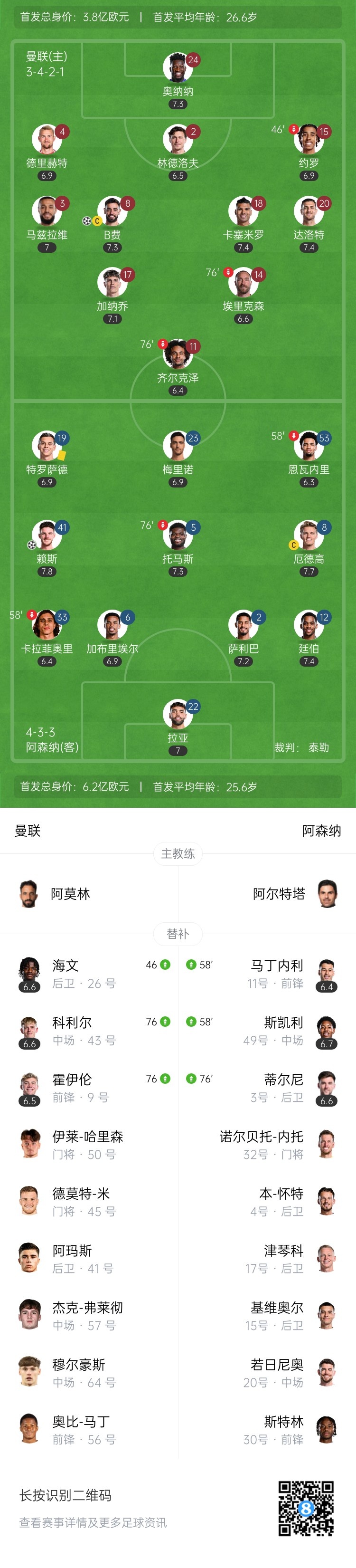 直播吧3月10日讯 北京时间3月10日凌晨0:30,2024-25赛季英超联赛第28轮焦点战,曼联坐镇老特拉福德球场迎战阿森纳。上半场特罗萨德铲倒加纳乔,曼联任意球机会,B费世界波建功,曼联暂1-0阿森纳;下半场赖斯破门为枪手扳平比分,最终曼联1-1阿森纳,各项赛事三连平;枪手英超3轮不胜,落后榜首15分。