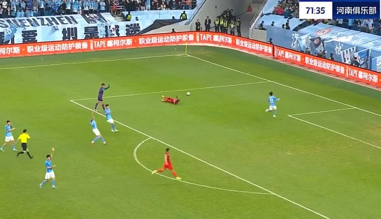第25分钟,有黄牌在身的叶力江撞翻对手,深圳众将围住裁判施压,但主裁没给第二张黄牌。↓