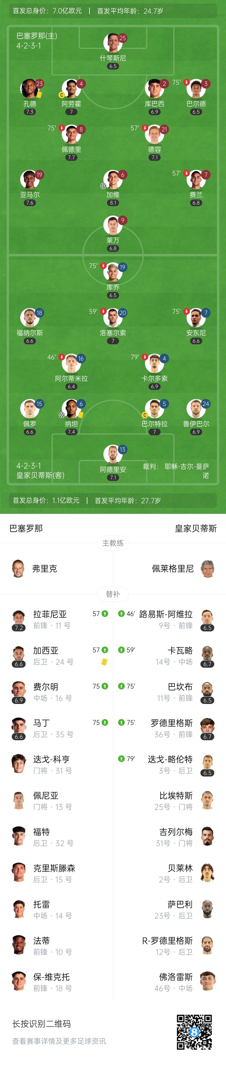 下半场伤停补时4分钟,全场比赛结束,最终巴萨1-1贝蒂斯。