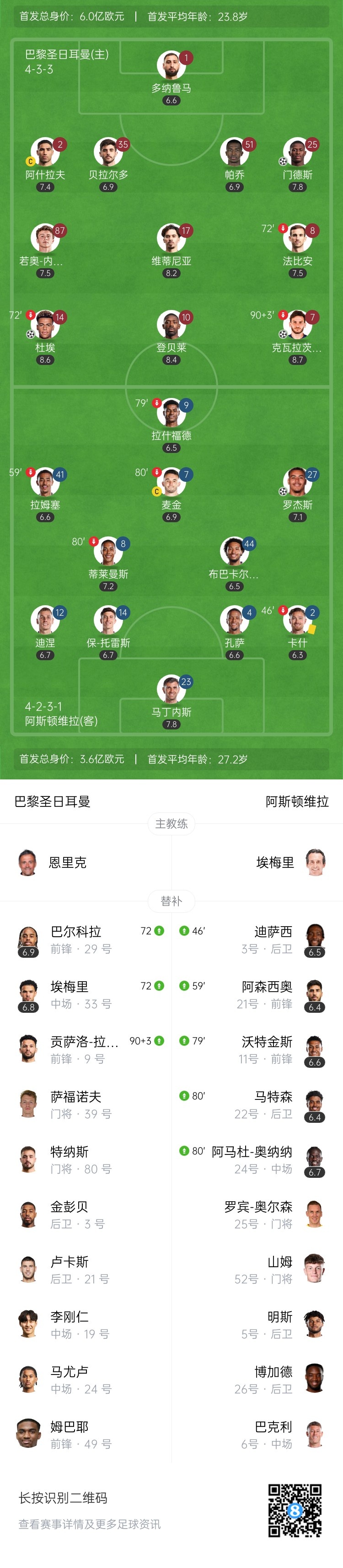 直播吧4月10日讯 北京时间3:00,欧冠1/4决赛首回合巴黎圣日耳曼vs阿斯顿维拉,比赛在王子公园球场打响!上半场,马丁内斯多次作出扑救,罗杰斯破门帮助维拉客场领先!杜埃世界波帮助巴黎扳平比分!下半场,克瓦拉茨赫利亚一条龙爆抽近角破门!补时阶段努诺-门德斯再补一刀!最终,巴黎3-1逆转维拉取胜,在两回合比赛中占得先机!