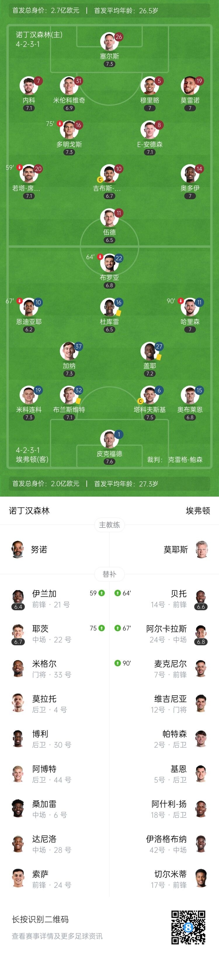 伤停补时5分钟。全场比赛结束,诺丁汉森林0-1埃弗顿。