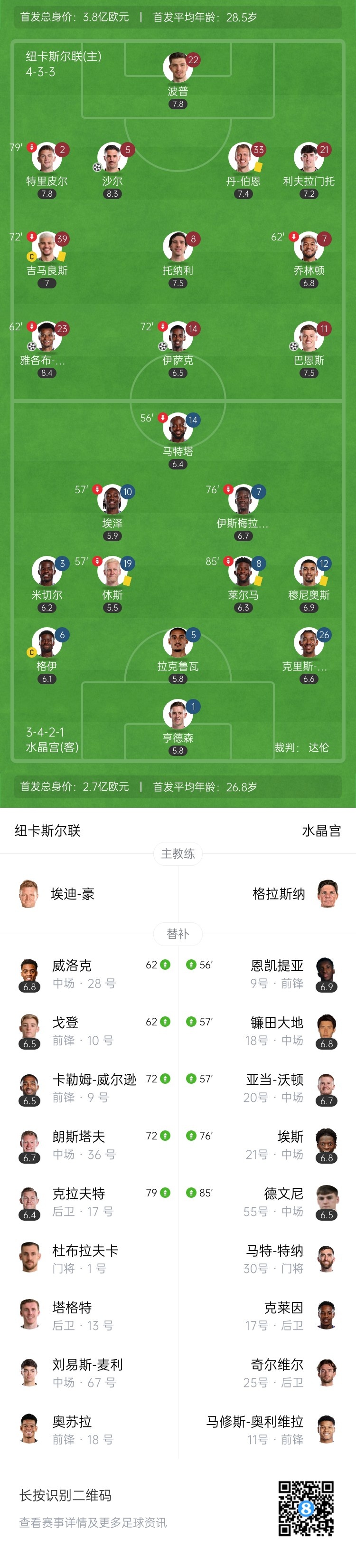 第38分钟,哈维-巴恩斯杀入禁区内左侧,左脚横传被格伊挡进自家大门!纽卡2-0领先水晶宫↓