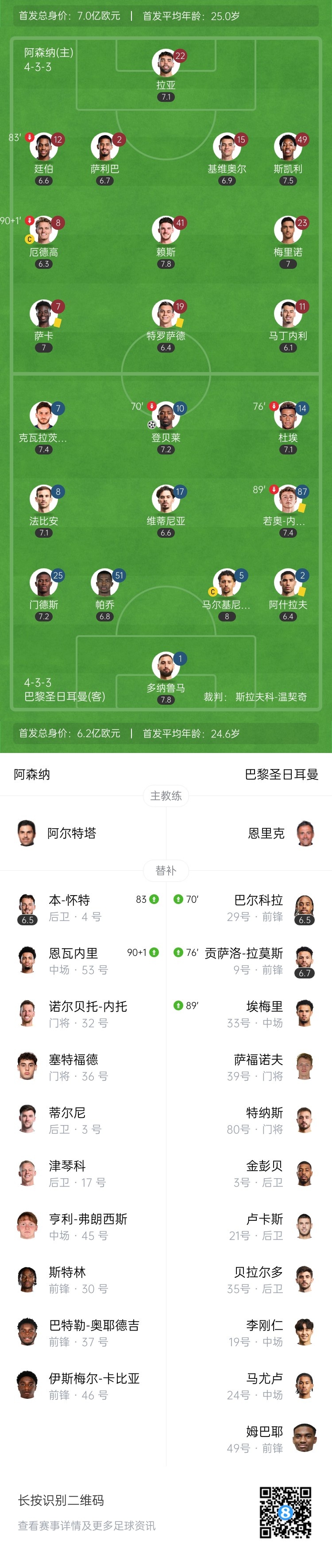 直播吧4月30日讯 北京时间3:00,欧冠半决赛首回合阿森纳vs巴黎圣日耳曼,比赛在酋长球场打响!上半场,登贝莱4分钟闪击破门!拉亚贡献多次扑救;萨卡在边路被吹犯规后发泄踢球,被出示黄牌;马丁内利单刀被多纳鲁马神扑化解!下半场,梅里诺头球破门但因越位无效!特罗萨德好机会,多纳鲁马再献神扑!贡萨洛-拉莫斯捅射中横梁!最终,阿森纳主场0-1不敌巴黎,次回合双方移师王子公园球场。