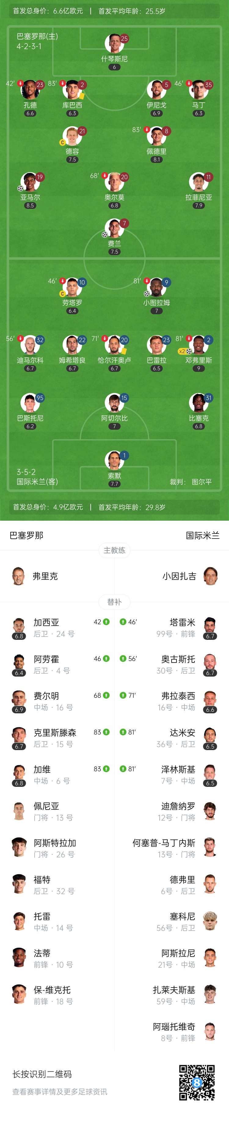 直播吧5月1日讯 北京时间3:00,欧冠半决赛首回合巴塞罗那vs国际米兰,比赛在奥林匹克体育场打响!上半场,邓弗里斯传中,小图拉姆开场30秒脚后跟闪击破门!随后角球中邓弗里斯侧钩破门!亚马尔个人能力1v5兜射破门!随后又击中横梁;费兰扳平比分!下半场,邓弗里斯头球破门完成双响!拉菲尼亚暴力远射反弹制造索默乌龙;姆希塔良破门因脚尖越位无效;亚马尔似传似射第二次中横梁!最终,巴萨主场3-3战平国米,双方次回合移师梅阿查!