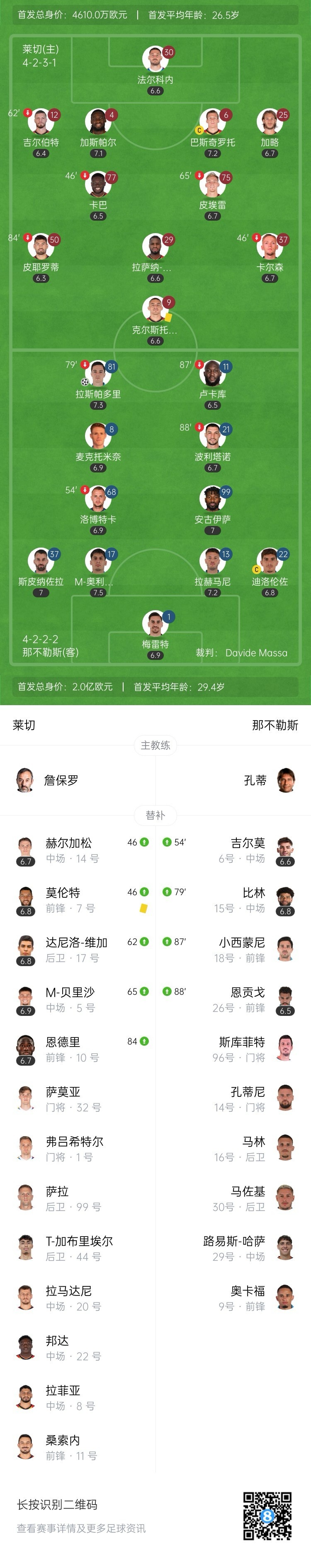 第24分钟,那不勒斯取得领先,他们获得禁区前沿任意球机会,拉斯帕多里主罚直接攻门,皮球飞入球网,那不勒斯1-0领先莱切。↓