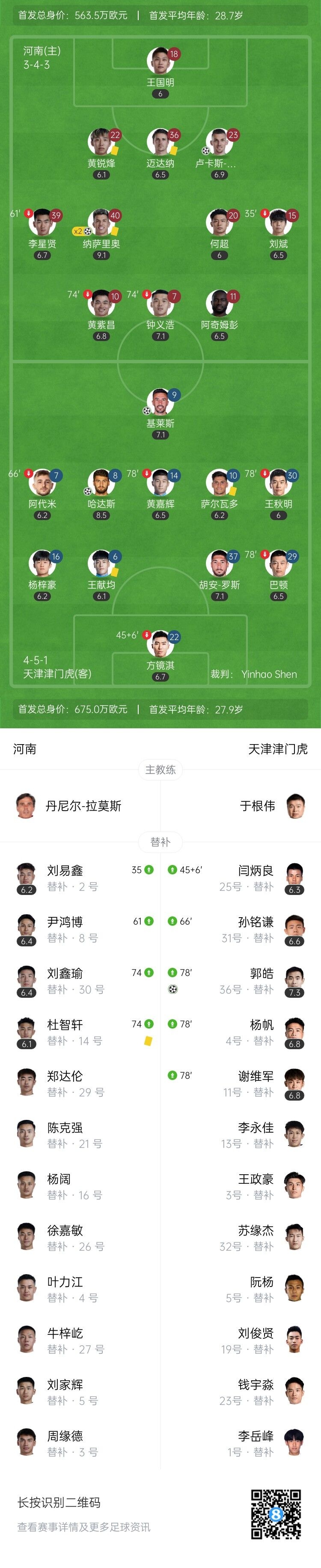 直播吧5月5日讯 北京时间5月5日晚上19:00,中超第11轮,河南坐镇郑州航海体育场迎战天津津门虎。上半场,王秋明送点,纳萨里奥点射命中,纳萨里奥自摆乌龙,刘斌伤退,基莱斯破门、方镜淇伤退,纳萨里奥双响。下半场,卢卡斯-马亚补射得手,迈达纳送点哈达斯命中,郭皓90分钟世界波绝杀。全场结束,河南3-4天津津门虎,河南新帅拉莫斯首秀无缘开门红。本场过后,河南积7分排名第14,天津津门虎积16分暂列第6。