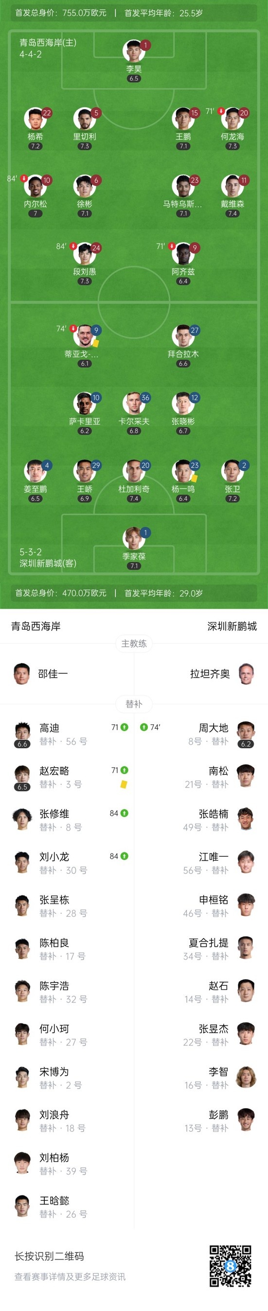 直播吧5月6日讯 北京时间5月6日19:35,中超联赛第11轮青岛西海岸迎战深圳新鹏城的比赛在西海岸大学城体育场进行,上半场开场20秒内尔松卢斯与马特乌斯接连中框,段刘愚抽射造险,深圳0射正,半场结束,青岛西海岸0-0深圳新鹏城。下半场内尔松卢斯抽射中柱,最终青岛西海岸0-0深圳新鹏城,西海岸积16分升至第6,深圳11分仍居第13。