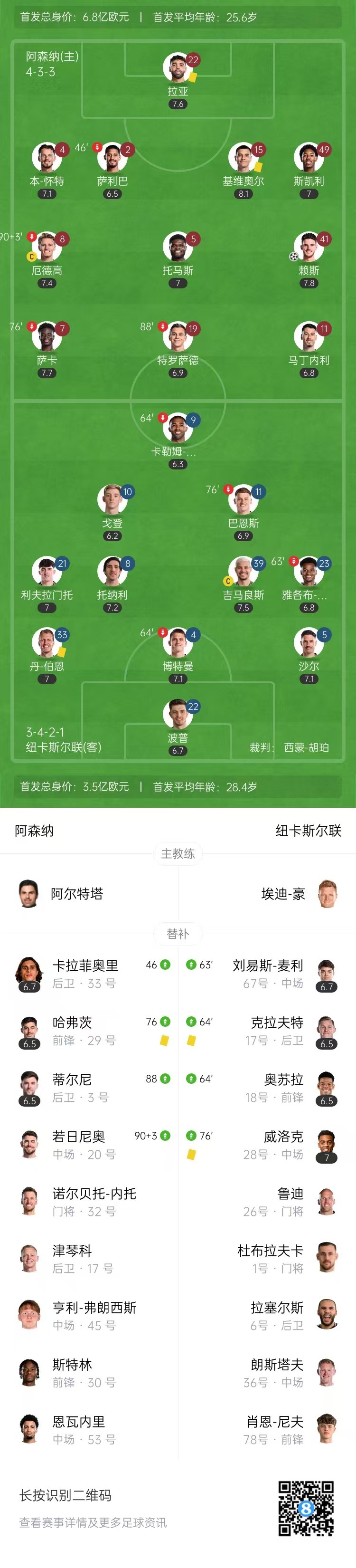 全场比赛结束,阿森纳1-0纽卡斯尔联。