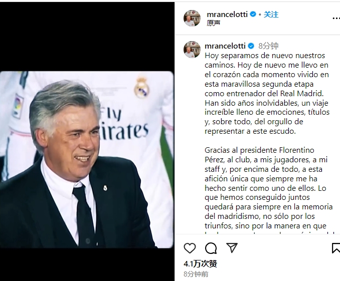 直播吧05月23日讯 皇马正式官宣安切洛蒂今夏离任,安帅在INS上动情发文,用一则视频作别。