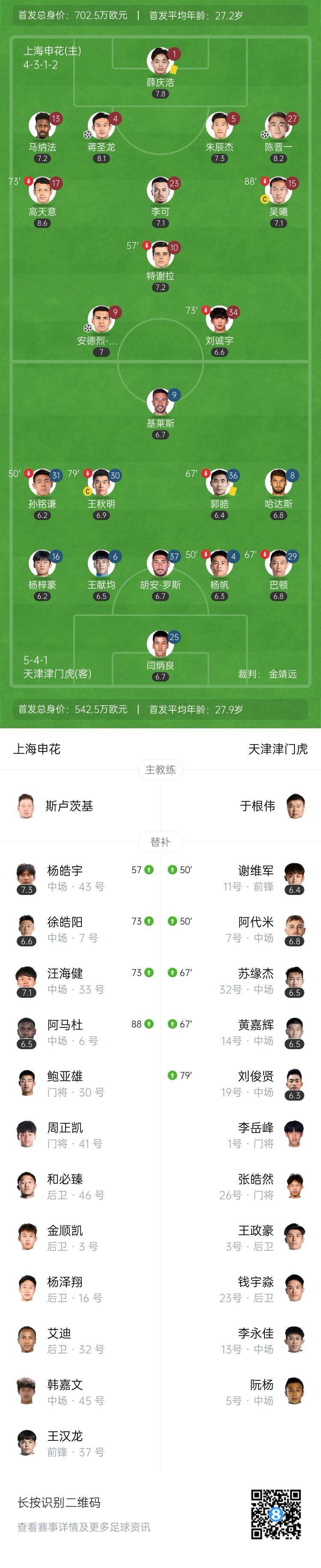 全场比赛结束,上海申花主场3-0完胜天津津门虎。