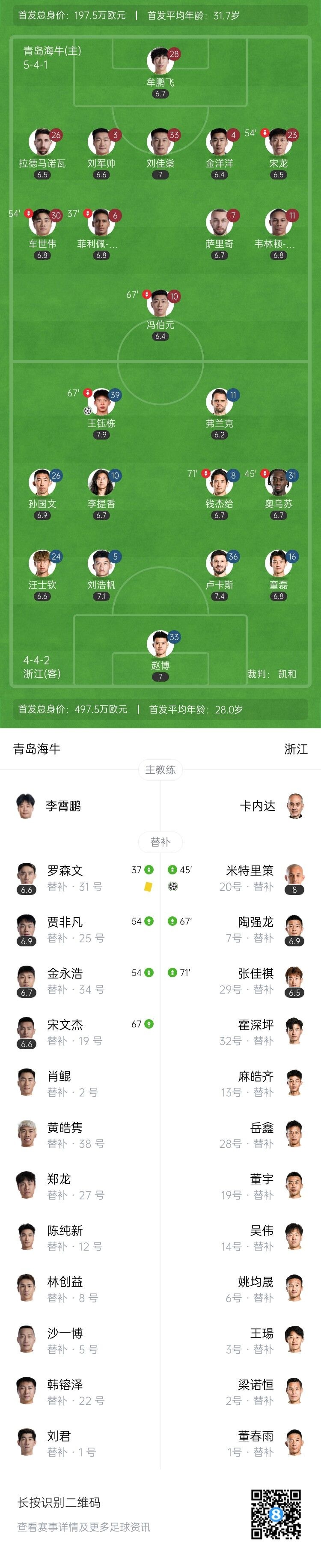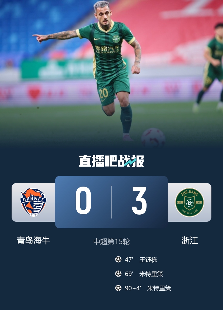 直播吧6月25日讯 北京时间6月25日晚上19:00,中超第15轮,青岛海牛坐镇青岛青春足球场迎战浙江。上半场,王钰栋造险,牟鹏飞神扑,奥古斯托伤退。下半场,米特里策首秀助攻王钰栋贴地斩闪击,王钰栋伤退,米特里策梅开二度。全场结束,青岛海牛0-3浙江。本场过后,青岛海牛积8分继续排名倒数第二,浙江积20分暂升第7。