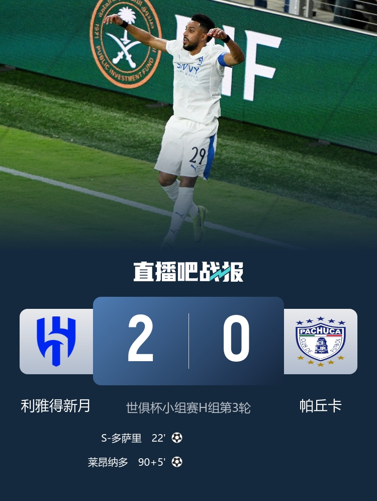 直播吧6月27日讯 北京时间9:00,世俱杯小组赛H组第3轮利雅得新月vs帕丘卡,比赛在吉奥迪斯公园球场打响!上半场,N-多萨里助攻S-多萨里,帮助利雅得新月取得领先!下半场,补时阶段莱昂纳多单刀破门!最终,利雅得新月2-0战胜帕丘卡,小组第二出线,1/8决赛将战曼城!帕丘卡小组赛三连败垫底出局!