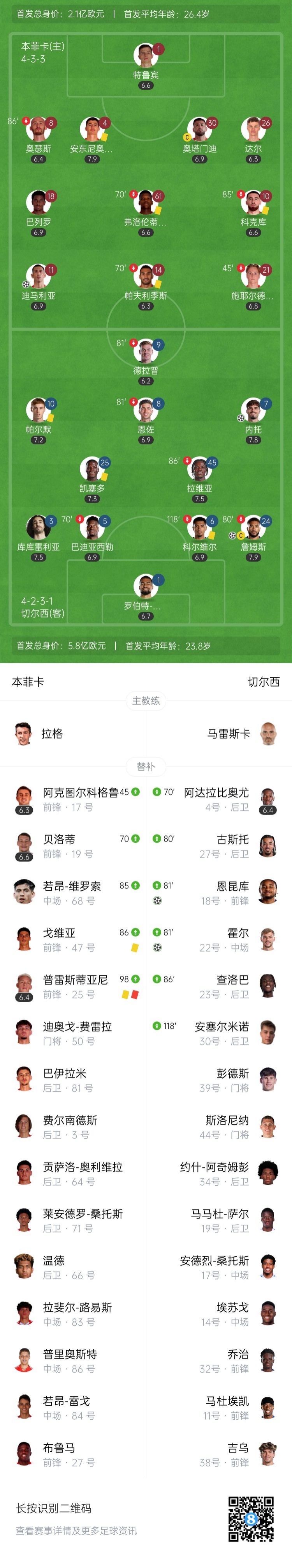 最终全场比赛结束,切尔西4-1淘汰本菲卡。