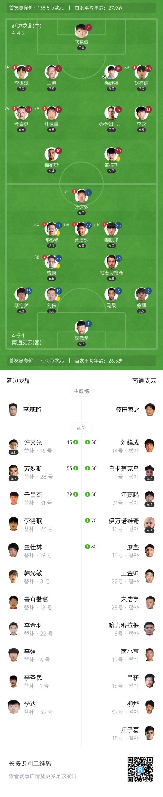 下半场补时8分钟,延边龙鼎1-0南通支云。