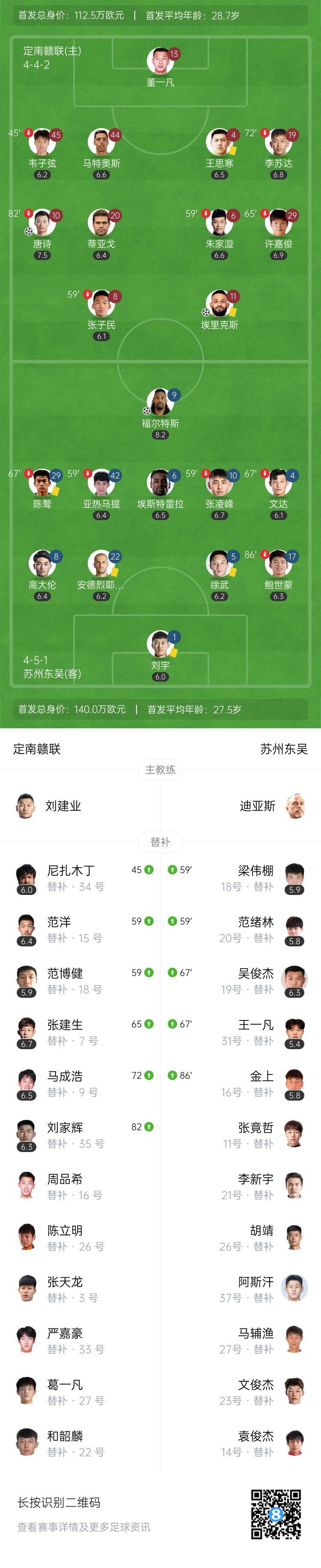 苏州东吴扳平!福尔特斯破门!第44分钟,福尔特斯面对多人防守分球到左路,亚热马提再回敲,福尔特斯跟进抢射得手,定南赣联1-1苏州东吴!↓