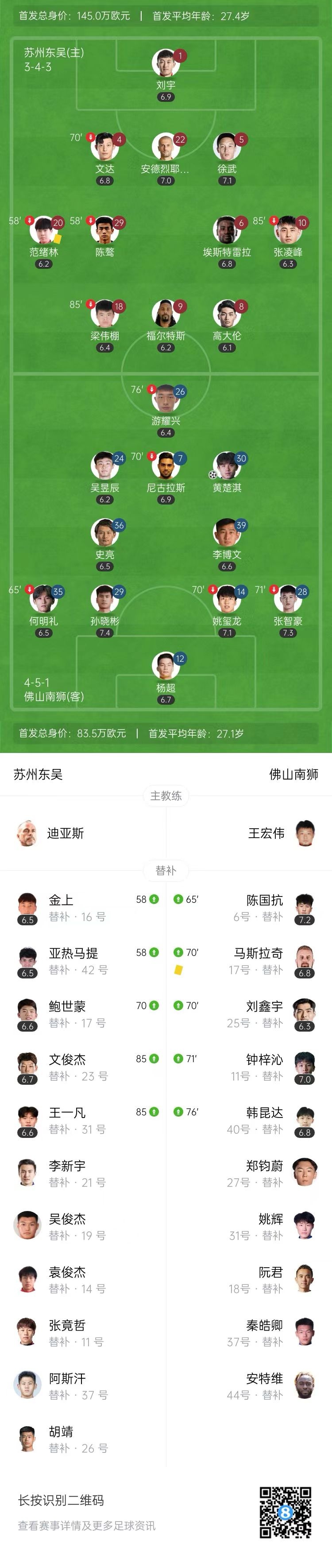 直播吧7月19日讯 北京时间7月19日19:00,中甲联赛第17轮,苏州东吴坐镇主场苏州市体育中心体育场迎战佛山南狮。上半场,双方均未制造出破门机会。下半场,福尔特斯近距离打门击中立柱,黄楚淇扫射破门绝杀。全场比赛结束,佛山南狮客场1-0战胜苏州东吴。