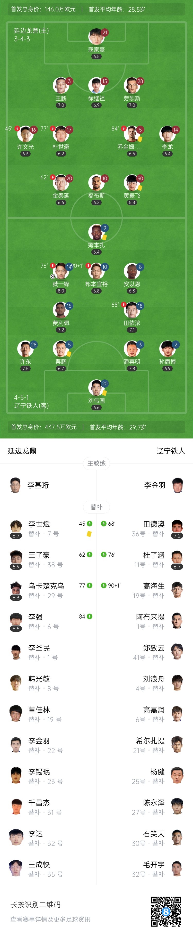 直播吧7月26日讯 北京时间18:00,中甲第18轮延边龙鼎vs辽宁铁人。上半场,双方均无建树。下半场,潘喜明助攻臧一锋破门!最终,辽宁铁人1-0战胜延边龙鼎,取得中甲4连胜+16轮不败!继续领跑中甲积分榜。