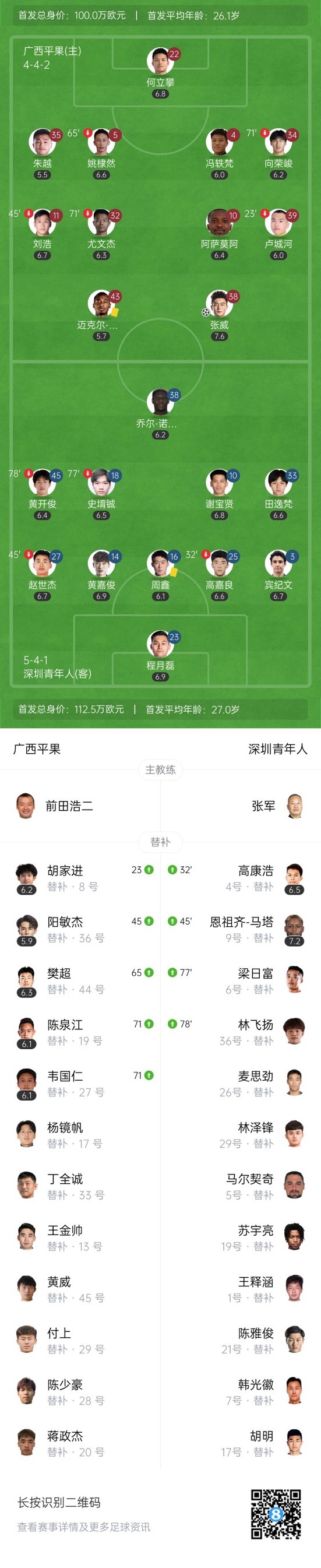 直播吧8月2日讯 北京时间8月2日19:30,中甲联赛第19轮广西平果迎战深圳青年人的比赛在平果体育场进行,上半场朱越助攻张威头球闪击得手,诺布尔传中造刘浩乌龙球,下半场马塔主罚点球破门反超比分,舍库点射绝平,朱越凌空侧钩绝杀,最终广西平果3-2深圳青年人近八轮首胜仍垫底,深圳青年人四轮不胜。