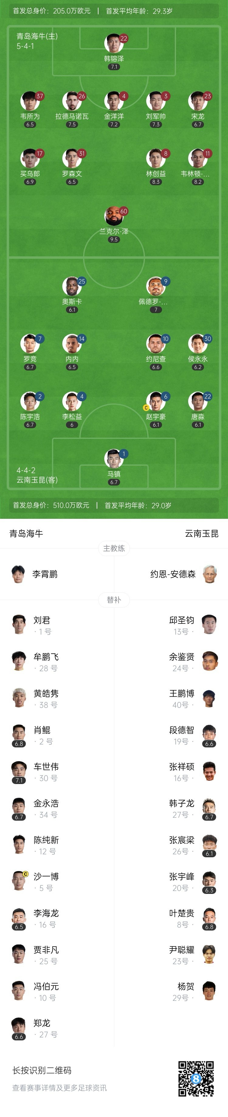 全场比赛结束,青岛海牛5-1大胜云南玉昆。