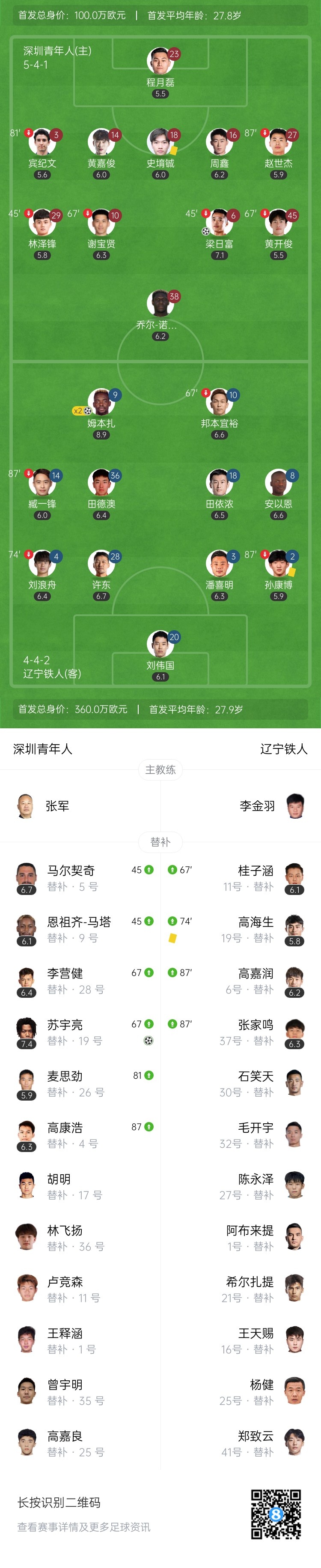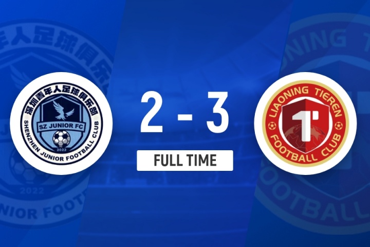 下半场补时8分钟。最终全场比赛结束,深圳青年人2-3辽宁铁人。