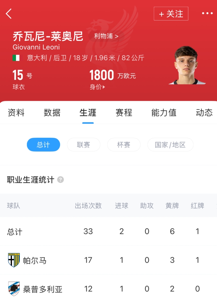 莱奥尼现年18岁,身高1米96司职中卫,球员目前德转估值1800万欧。