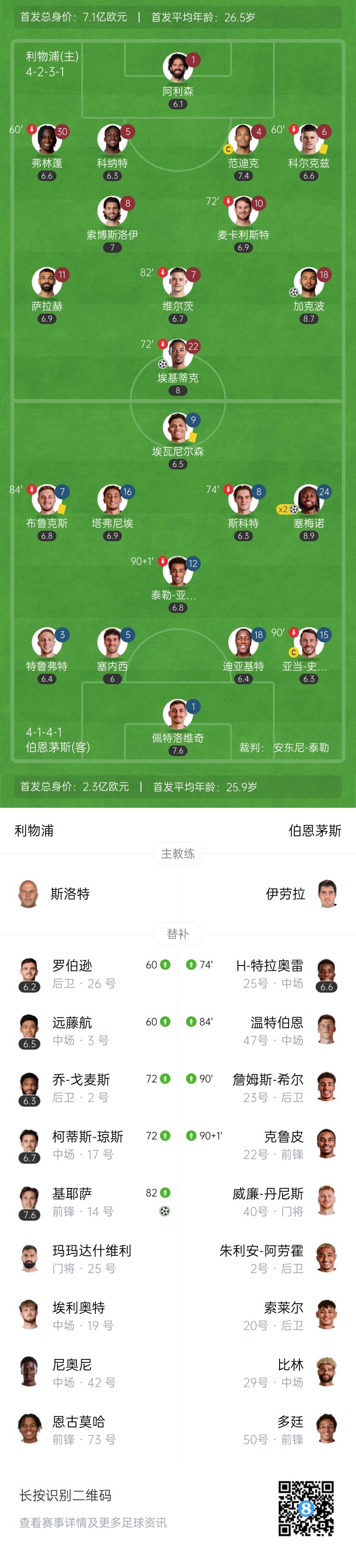 下半场补时6分钟。最终全场比赛结束,利物浦4-2伯恩茅斯。