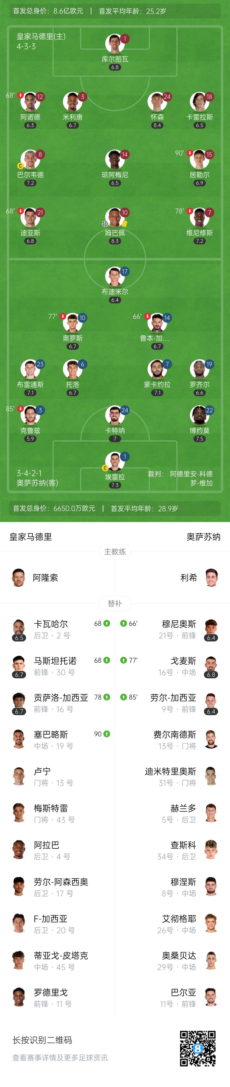 下半场补时5分钟。最终全场比赛结束,皇马1-0奥萨苏纳。