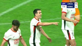 玉昆扳平!侯永永端射破门!第33分钟,李松益挑传到禁区,侯永永插上一脚凌空端射变成吊门,皮球越过刘殿座飞进网窝,云南玉昆1-1成都蓉城!↓