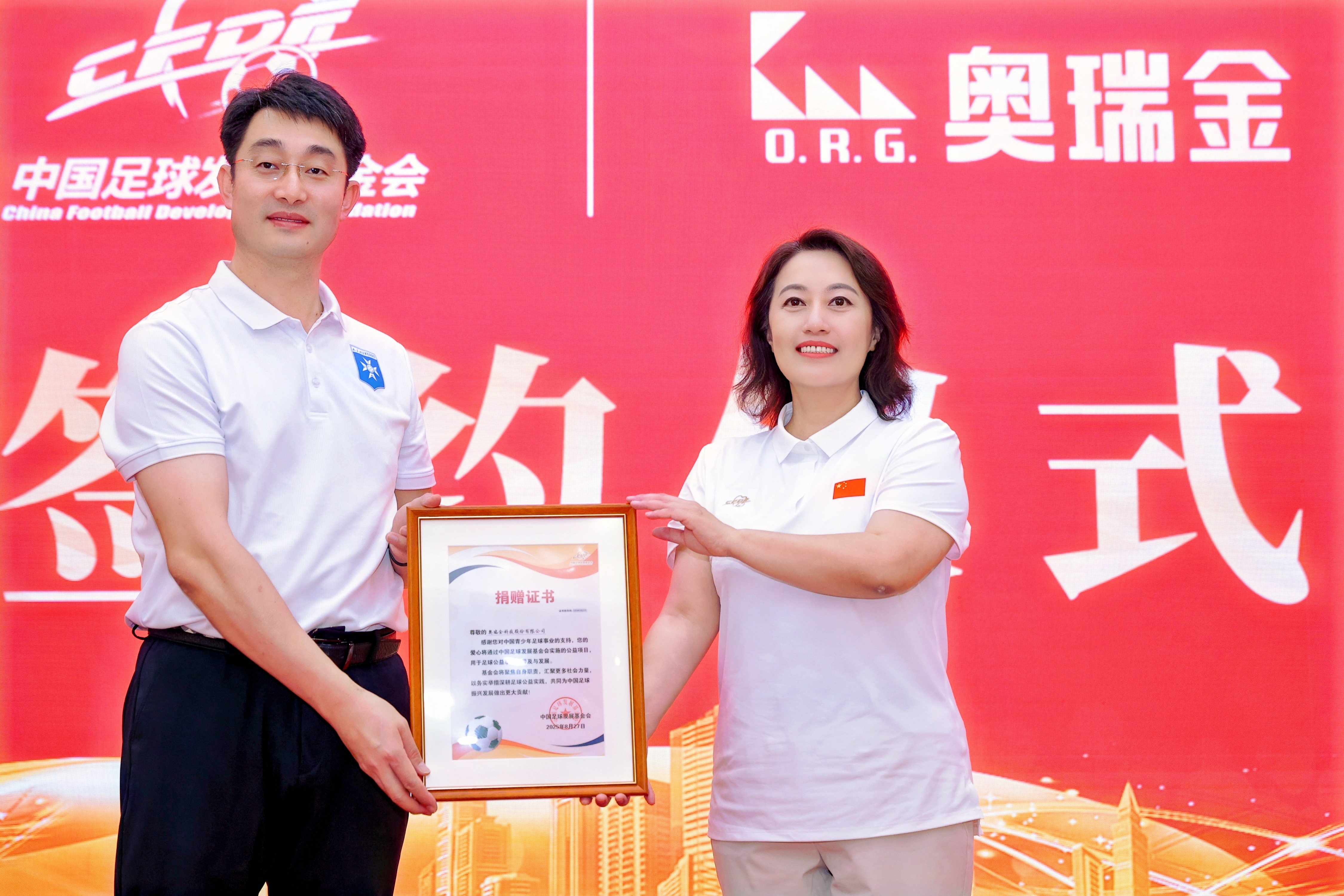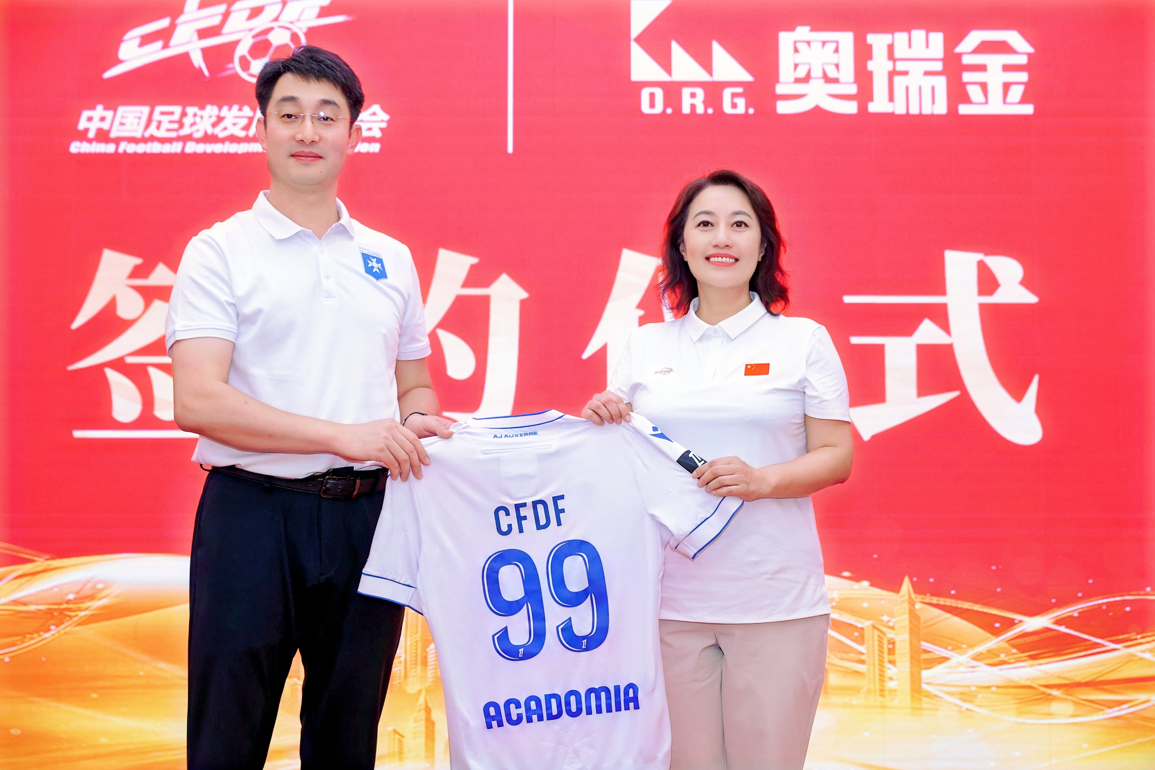 奥瑞金国际控股有限公司总经理王冬表示,奥瑞金将带领法甲俱乐部欧塞尔联手中国足球发展基金会,在青少年足球海外培养、赛事品牌打造、青训教练员培训等方面开展长期合作,双方依托优质资源,强强联手,共同推动中国青少年足球的发展。签约仪式上,王冬向基金会赠送99号球衣,寓意以“真抓实干 久久为功”青训理念,将青少年球员海外培养做出实效。