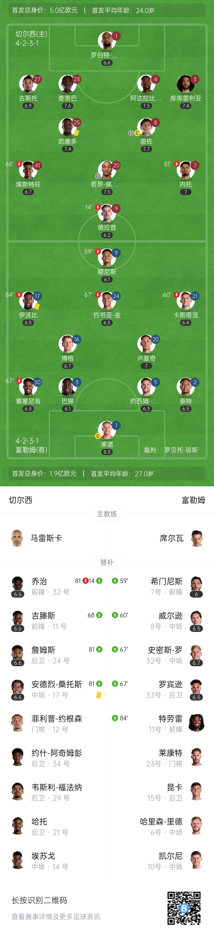 第51分钟,查洛巴传中造成塞塞尼翁禁区内手球,VAR长时间介入连续回溯多个疑似犯规事件,主裁倒序回看了塞塞尼翁的手球、凯塞多的犯规、佩德罗的手球,最终选择判罚塞塞尼翁禁区内的手球,切尔西获得点球,恩佐主罚命中本场传射建功,切尔西2-0领先↓
