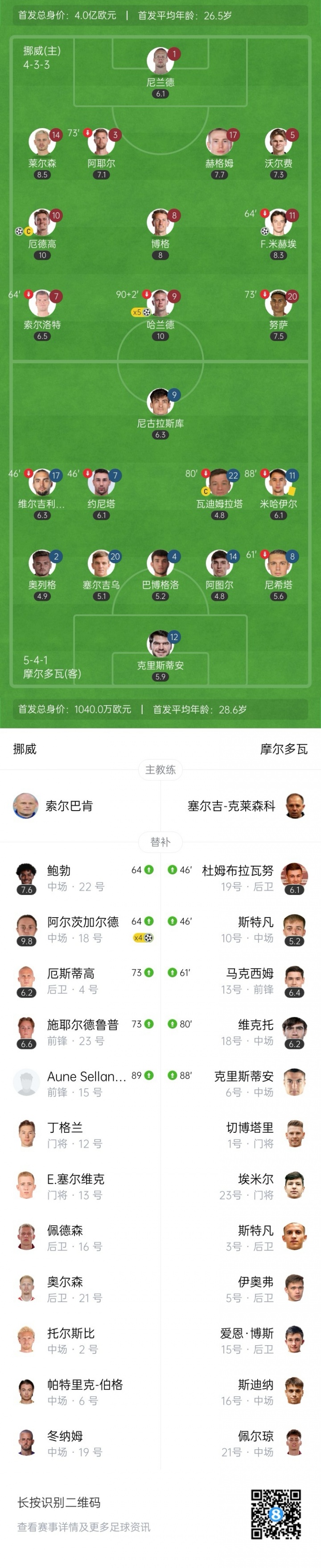 直播吧09月10日讯 北京时间9月10日凌晨02时45分,世预赛欧洲区小组赛I组第6轮在挪威乌勒瓦尔球场开战,挪威主场迎战摩尔多瓦。上半场哈兰德助攻F-米赫埃首开纪录,随后哈兰德连入3球,厄德高破门并送出2记助攻。下半场哈兰德2球1助+让点,阿尔茨加尔德替补登场大四喜,厄斯蒂高送乌龙。最终哈兰德本场五子登科并助攻双响,挪威11-1狂胜摩尔多瓦,I组积分榜挪威积15分21净胜球领跑。