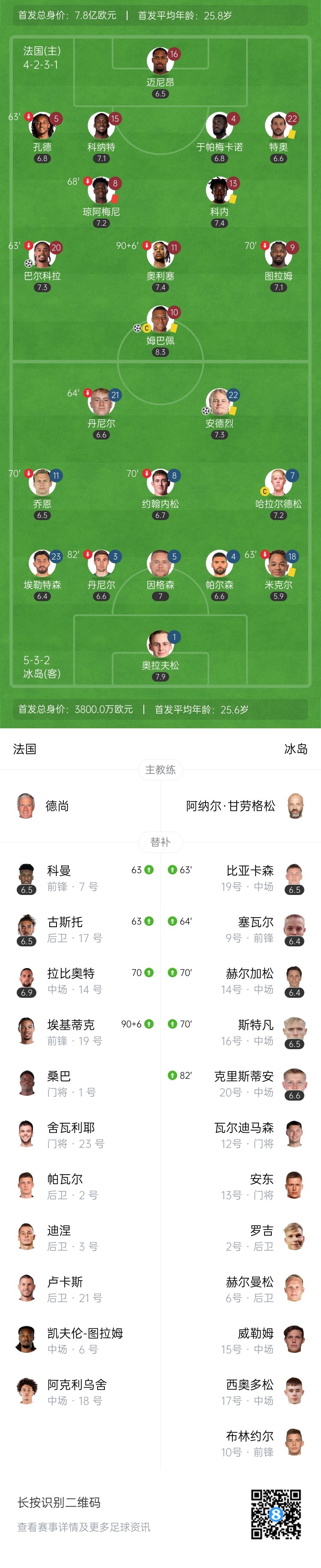 直播吧9月10日讯 世预赛欧洲区小组赛D组第二轮,法国坐镇主场王子公园球场迎战冰岛。上半场,奥利塞致命失误乌龙助攻,古德约翰森破门,姆巴佩点射。易边再战,姆巴佩助攻巴尔科拉破门,琼阿梅尼直红,古德约翰森绝平被吹。最终法国2-1冰岛。积分榜方面,法国两连胜领跑,冰岛2轮3分。
