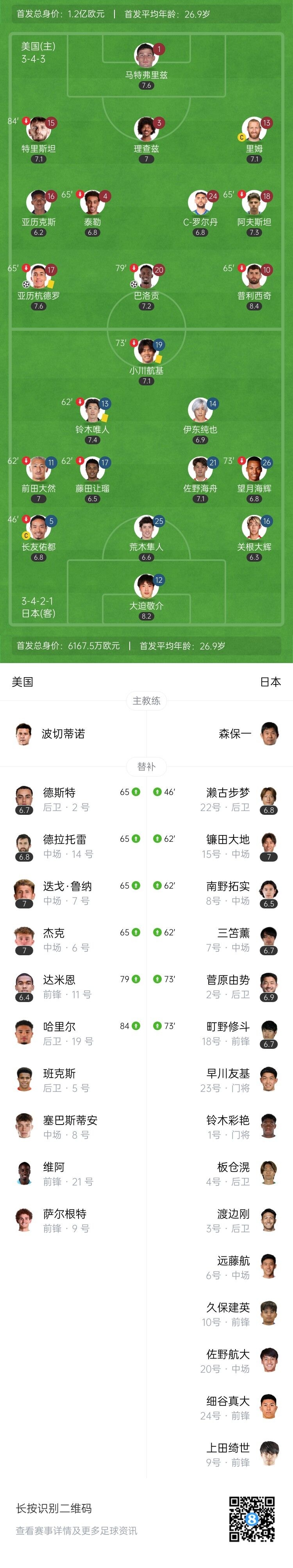 直播吧9月10日讯 北京时间9月10日早上7:30,一场友谊赛,美国坐镇箭头体育场对阵日本。上半场,阿夫斯坦助攻亚历杭德罗破门。下半场,巴洛贡再下一城,小川航基中框。全场结束,美国2-0日本。