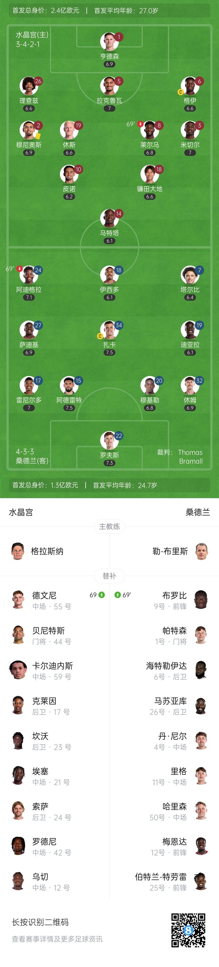 直播吧9月13日讯 北京时间9月13日晚上22:00,英超第4轮,水晶宫坐镇塞尔赫斯特公园球场迎战桑德兰。上半场,皮诺失单刀。下半场,镰田大地远射造威胁,罗夫斯屡屡救主。全场结束,水晶宫0-0桑德兰。本场过后,水晶宫1胜3平积6分排名第七,桑德兰2胜1平1负积7分排名第五。