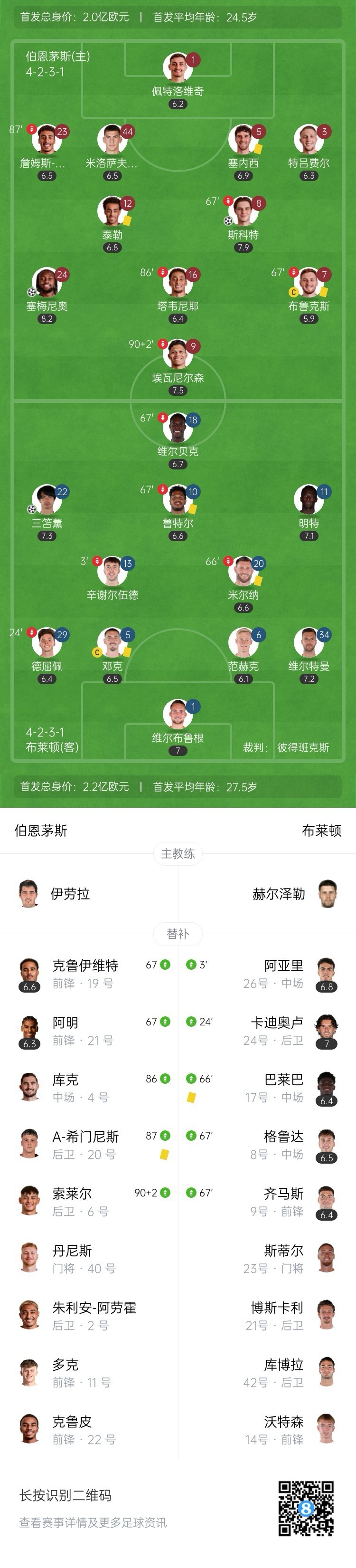 全场比赛结束,伯恩茅斯主场2-1战胜布莱顿。
